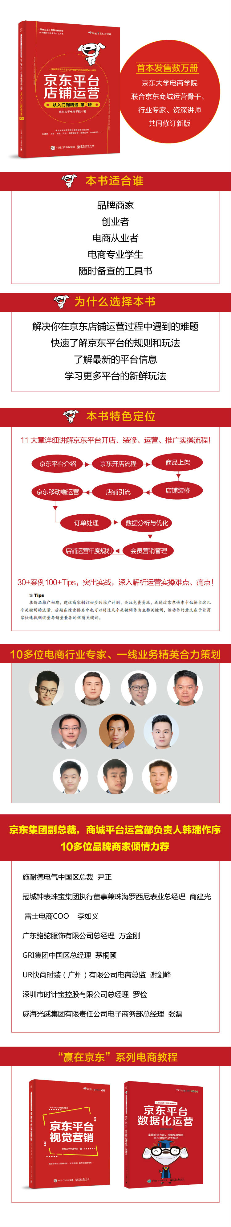 京东大学电商学院所著《京东平台店铺运营从入门到精通》一书出版之后, 深受电商从业人员及爱好者的好评,一度跃居京东商城电商管理类书籍销量榜首。